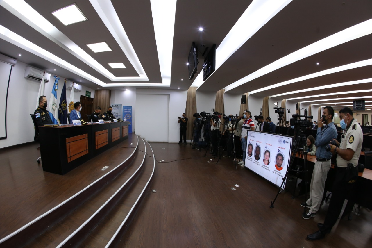 El director General de la Policía Nacional Civil (PNC), Héctor Hernández, el subdirector General de Investigación Criminal, AdalRodríguez, el comisario General de la División Especializada en Investigación Criminal (DEIC), David Custodio y el fiscal de Sección contra la Trata de Personas del Ministerio Público (MP), Alexander Colop informaron sobre la desarticulación de la banda criminal “Acapulco” vinculada al delito de explotación sexual.