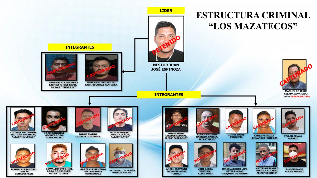 Los detenidos son presuntos responsables de planificar, coordinar y ejecutar ataques armados contra la vida de personas comerciantes, identificados como: Nestor Juan José Espinoza el líder de la banda, Rubén Florido López Gramajo alias “Negro”, Jorge Mario Quiroa González, Jimmy Josué Pérez Pia, Luis Alfonso Paredes Espinal alias “Catracho”, Tania Patricia Hernández Mensoza, Edgar Emigdio Barreda García, José Boronat Monterroso, Gerber Gudelio Enríquez García, Ludwin Geovanni Beltrán Pacheco y Mynor Rafael López Azañon, así como a Manuel de Jesús Celda Alvarado, Ottoniel de Jesús Pineda Sicán, Junior David Puche Solano de nacionalidad colombiana, Ángela Estela Menjivar Guardado, Mario Alejandro García Schauffler, Yoni Garza Ventura, Jorge Alberto Lepe Matías, Mayer Alejandro Arriola Álvarez, María Clementina Del Milagro Hernández, Oswaldo Ottoniel Lara Rodríguez y a Mynor Rafael López Azanon.