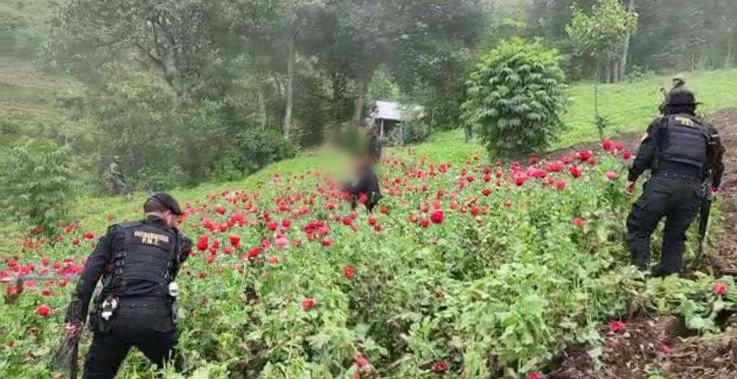 En el marco del estado de sitio en Tajumulco e Ixchiguán, San Marcos, elementos de la Subdirección General de Análisis de Información Antinarcótica (SGAIA) de la Policía Nacional Civil (PNC) y personal del Ejército de Guatemala erradicaron 3848 matas de amapola con un avalúo aproximado de Q296 200.