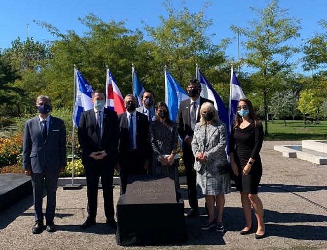 Quebec, Canadá, 16 de septiembre de 2021. Autoridades del Gobierno de Quebec, Canadá, develaron una placa conmemorativa del Bicentenario de Independencia de América Central en el Parque de América Latina de esa ciudad en homenaje a Guatemala, Costa Rica, El Salvador, Honduras y Nicaragua.