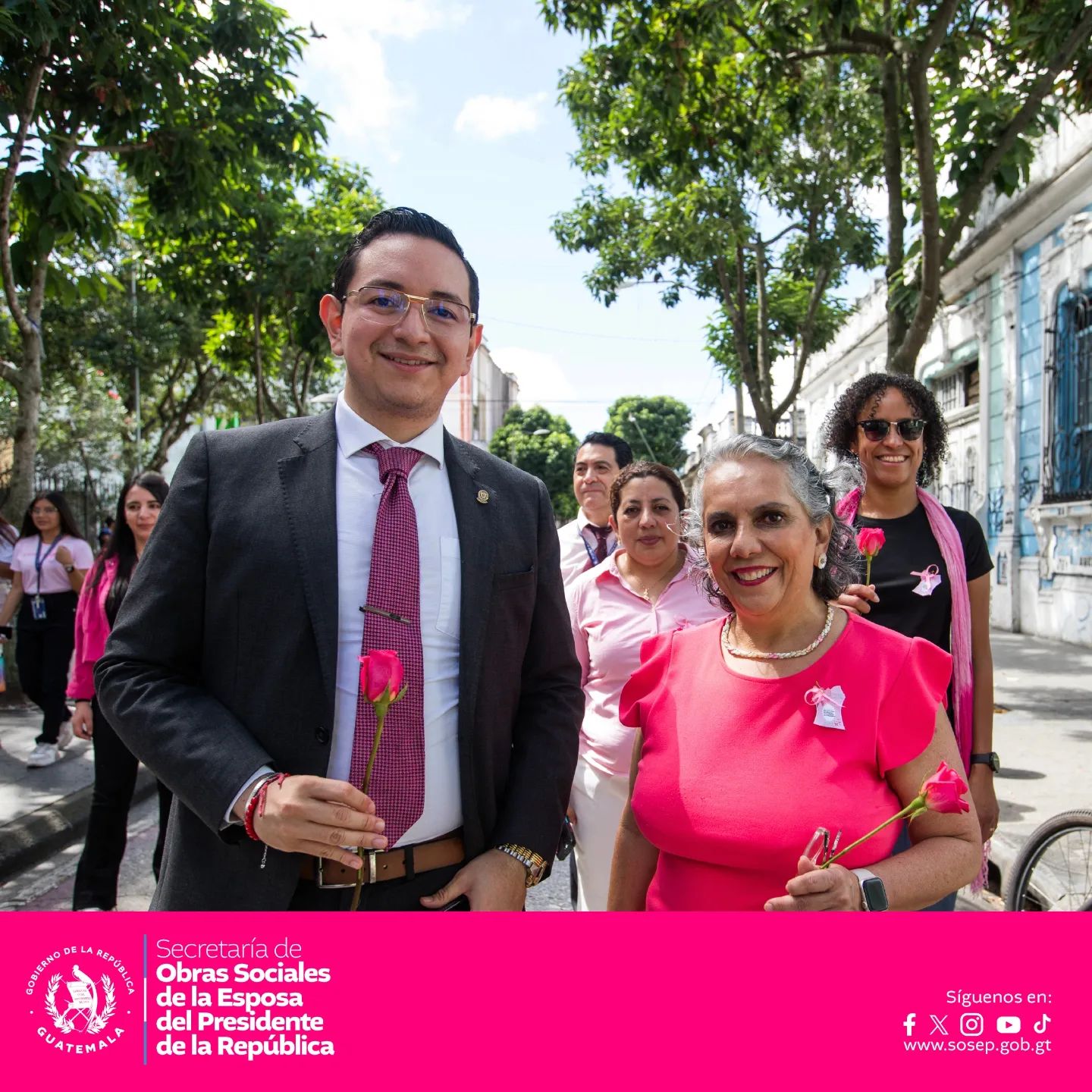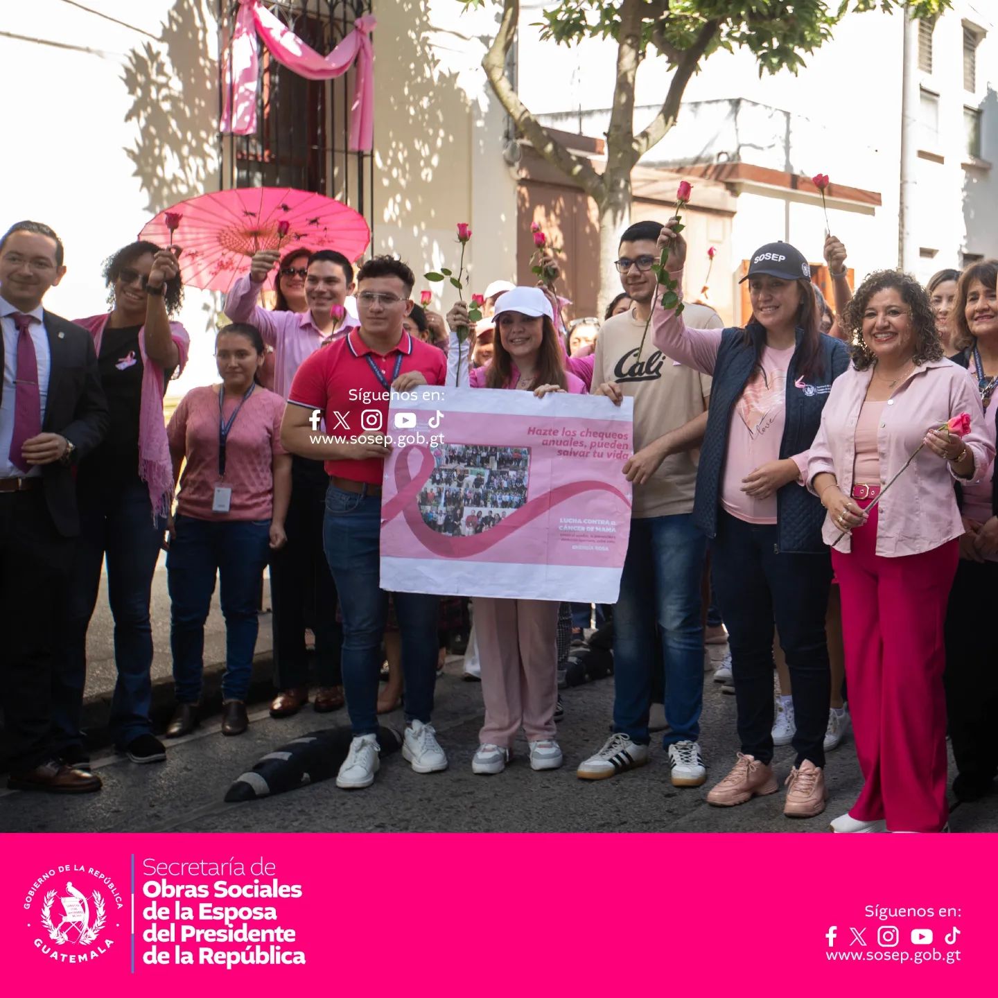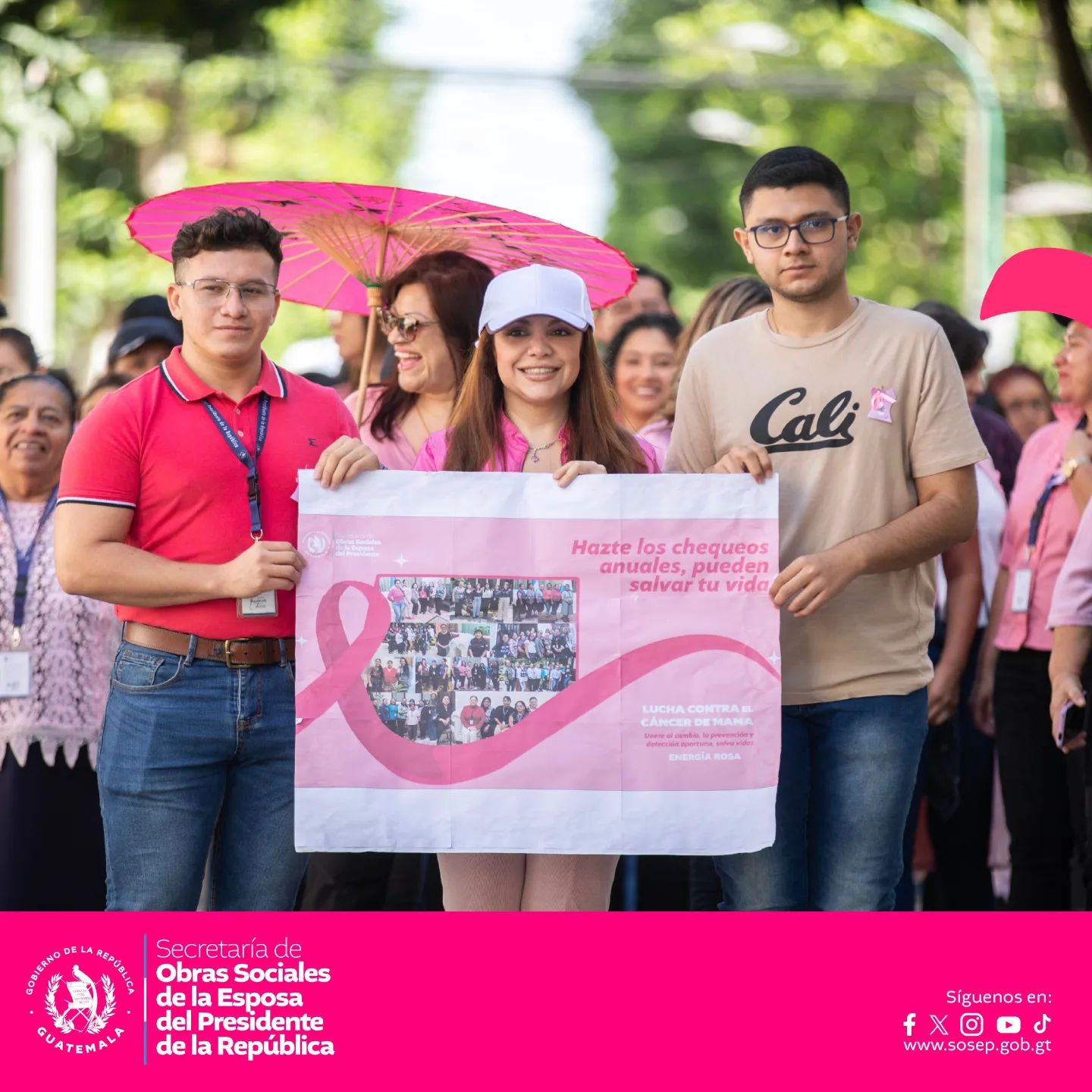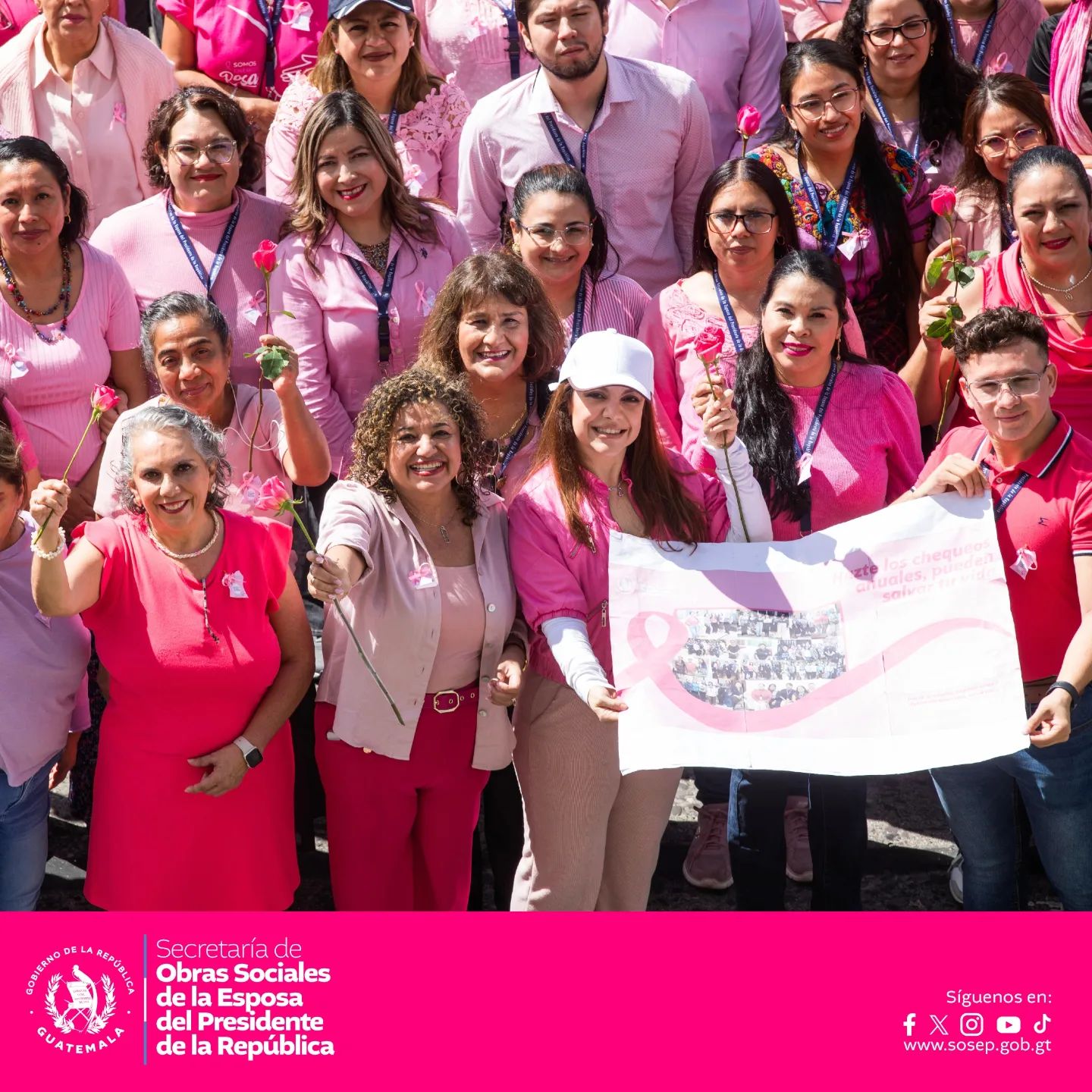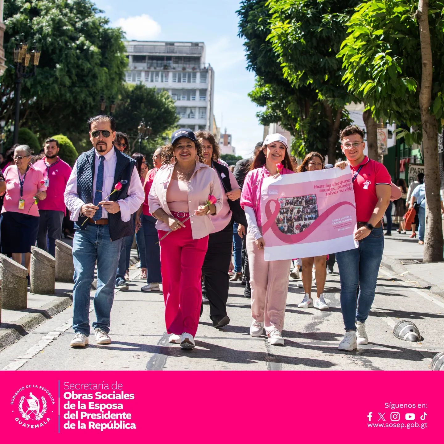 La caminata, que tuvo lugar en los alrededores de Casa Presidencial, Plaza de la Constitución y Casa Administrativa Sosep, se llenó de mensajes de apoyo y esperanza para todas las mujeres y hombres que enfrentan el cáncer de mama. La Dra. Calderón, en su discurso, destacó la importancia de la detección temprana y el acceso a tratamientos adecuados, enfatizando que la lucha contra esta enfermedad es un esfuerzo colectivo que requiere la participación activa de toda la sociedad.