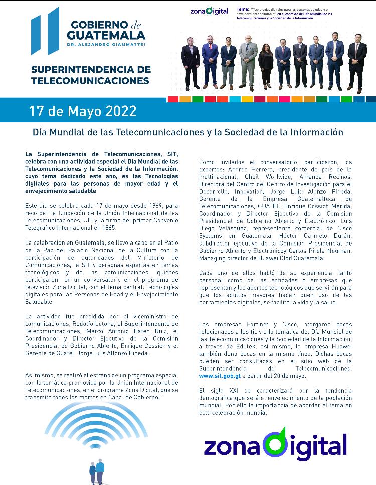 La Superintendencia de Telecomunicaciones, SIT, celebra con una actividad especial el Día Mundial de las Telecomunicaciones y la Sociedad de la Información, cuyo tema dedicado este año, es las Tecnologías digitales para las personas de mayor edad y el envejecimiento saludable