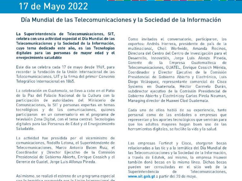 La celebración en Guatemala, se llevó a cabo en el Patio de la Paz del Palacio Nacional de la Cultura con la participación de autoridades del Ministerio de Comunicaciones, la SIT y personas expertas en temas tecnológicos y de las comunicaciones, quienes participaron en un conversatorio en el programa de televisión Zona Digital, con el tema central: Tecnologías digitales para las Personas de Edad y el Envejecimiento Saludable.