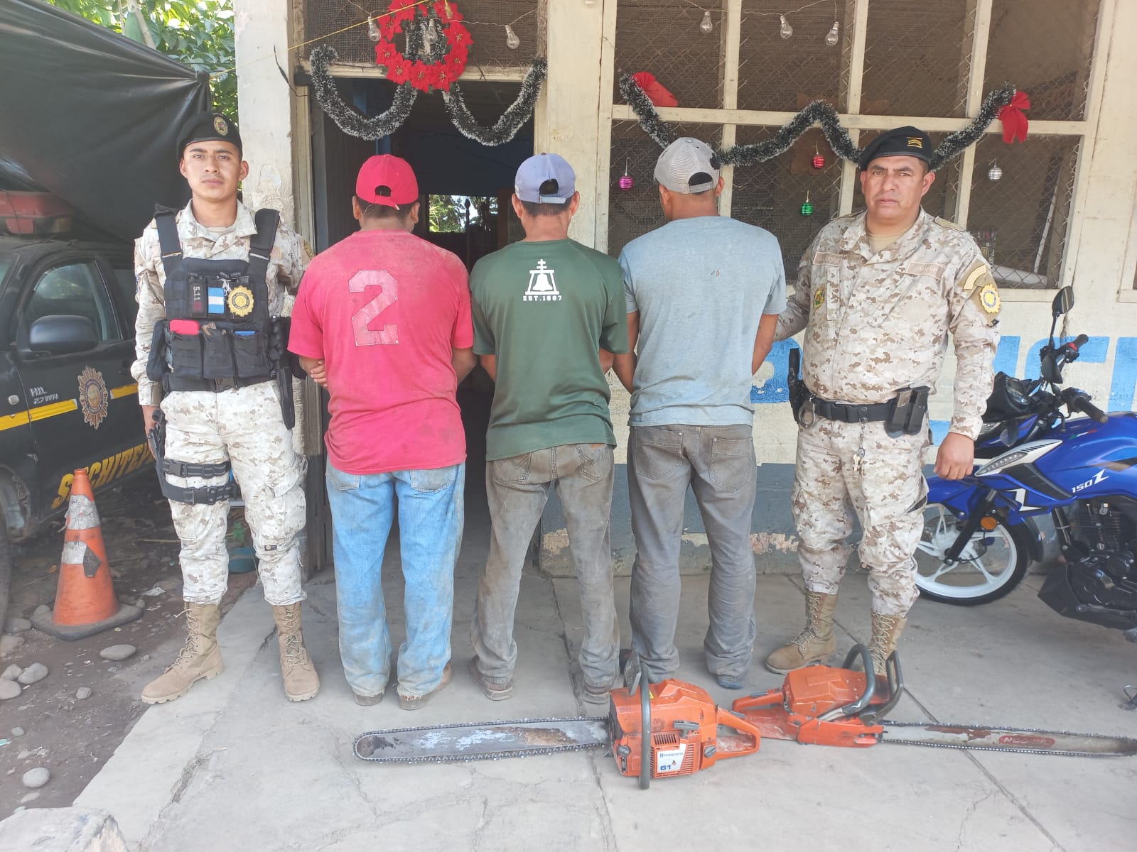 Agentes de la División de Protección a la Naturaleza (Diprona) de la Policía Nacional Civil capturaron a tres personas el 25 de enero cuando talaban árboles en la línea A9, sector Ican, en San José la Máquina, Suchitepéquez.
