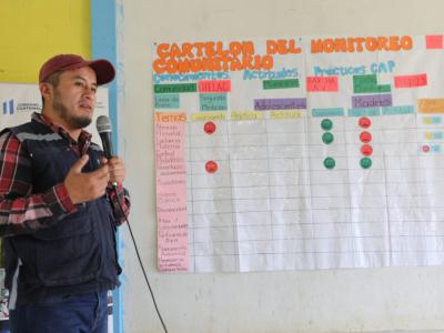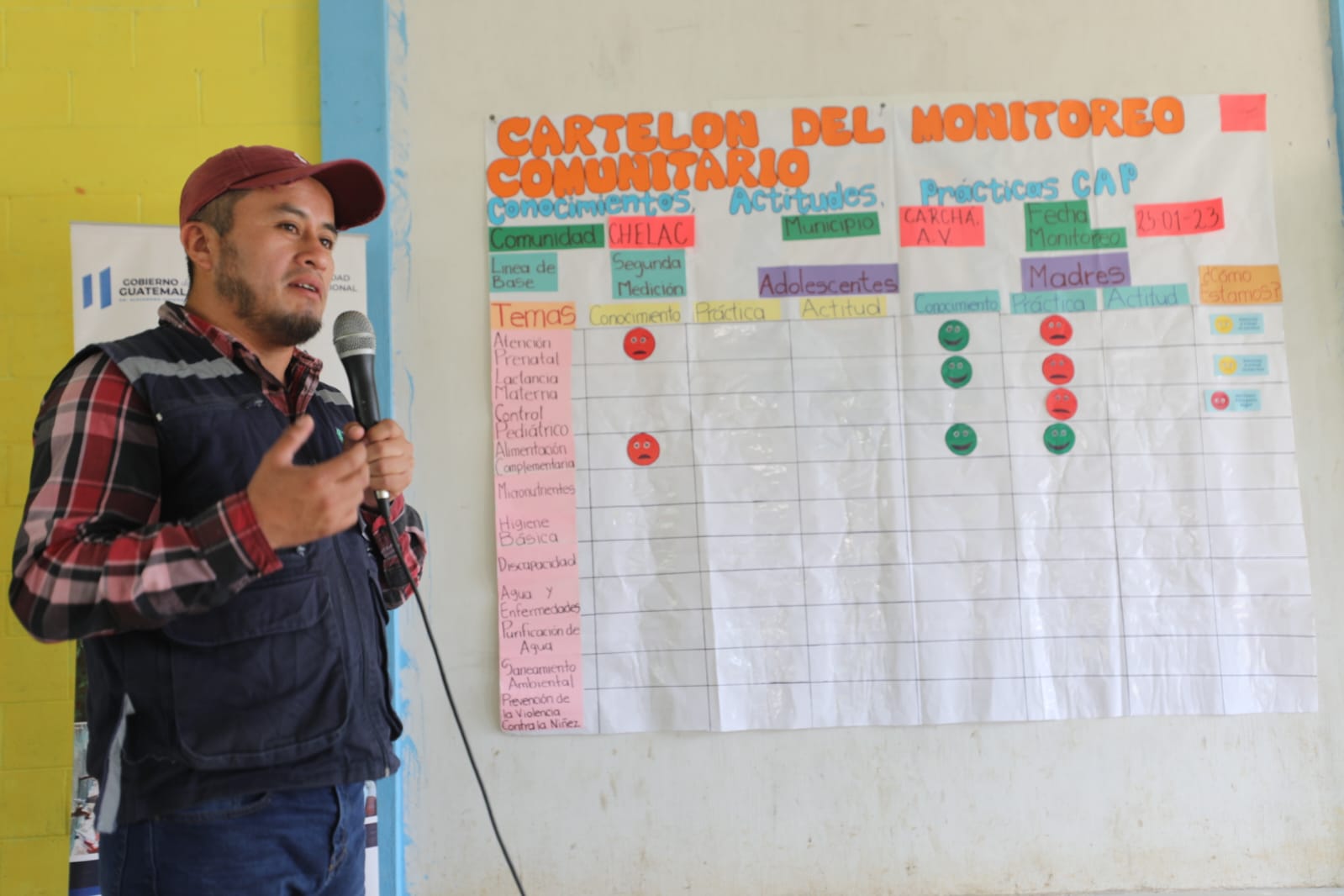 Posteriormente, en la aldea Chelac, San Pedro Carchá, Alta Verapaz, Aguayo conoció la presentación del monitoreo comunitario de conocimientos, actitudes y prácticas en salud y nutrición, desarrollado por la SESAN y que fue impartida en los idiomas q’eqchí y epañol.