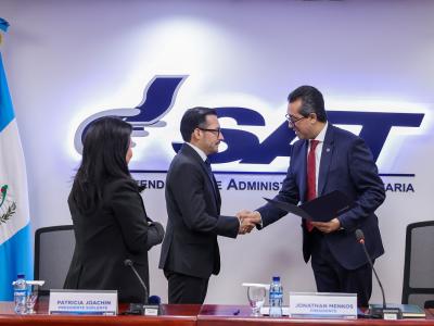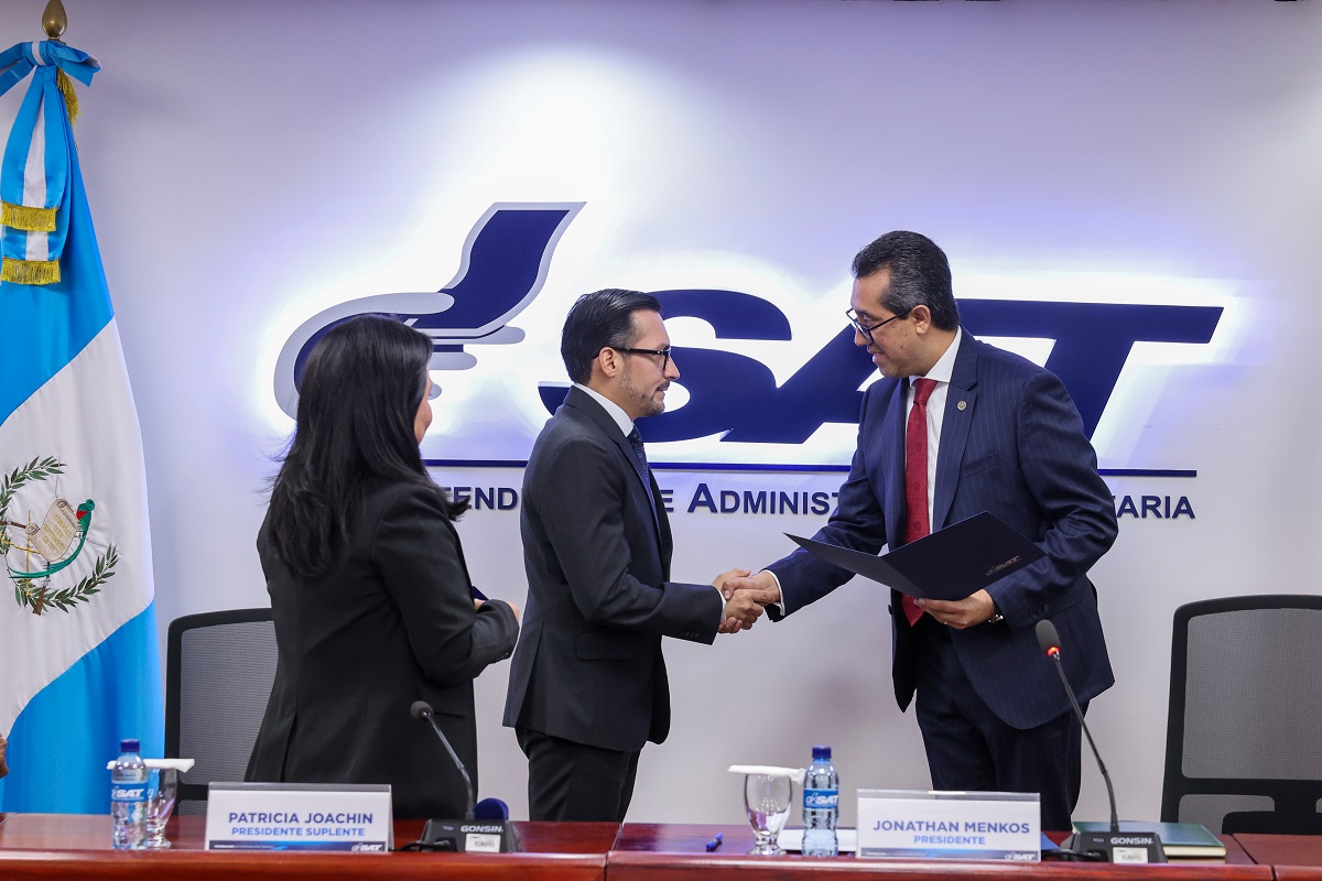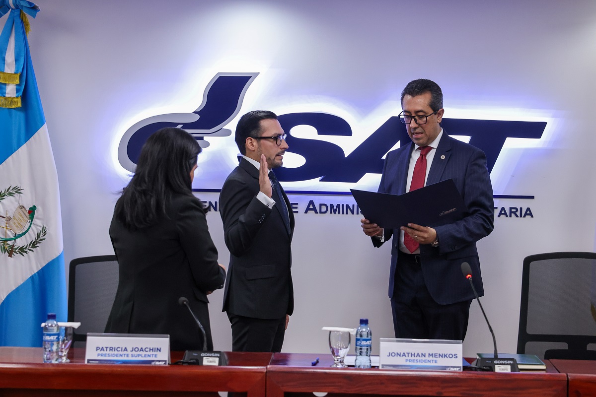 Jonathan Menkos Zeissig, presidente del Directorio de la Superintendencia de Administración Tributaria (SAT), juramentó este 14 de abril a Werner Ovalle Ramírez como nuevo superintendente de la entidad, quien ejercerá el cargo durante el periodo 2025-2030, tras concluir el proceso de selección regulado por el artículo 24 de la Ley Orgánica de la SAT.