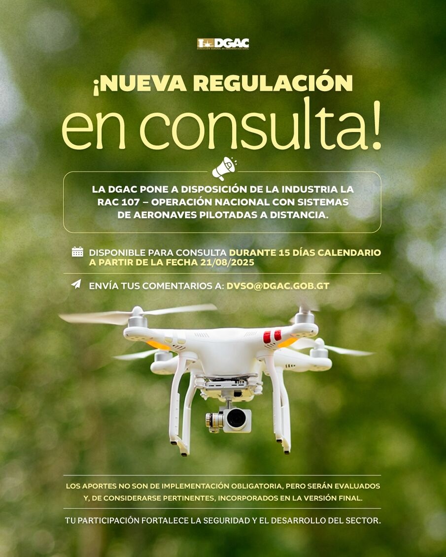 La DGAC reafirma su compromiso de trabajar de la mano con el sector público y privado para fortalecer la normativa nacional y garantizar que el uso de drones en Guatemala se desarrolle de manera ordenada, segura y en beneficio de la sociedad.