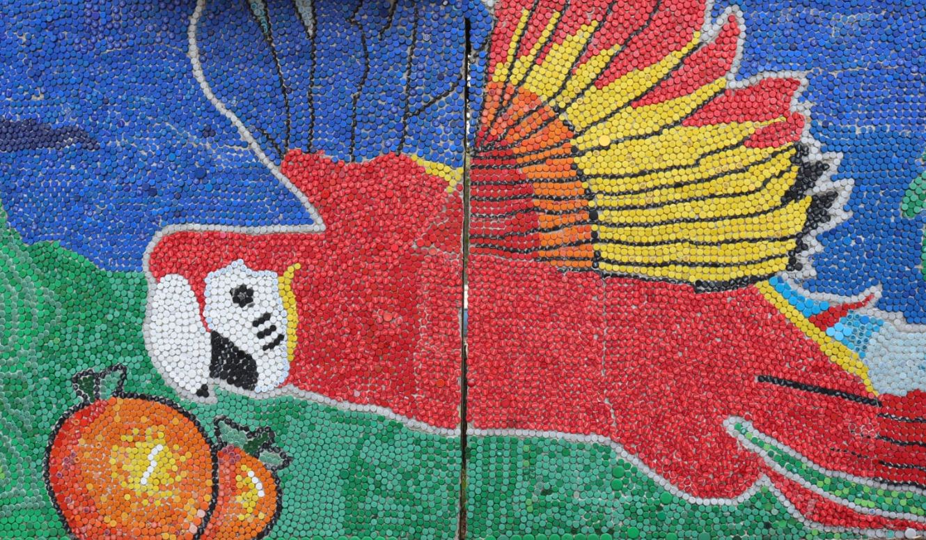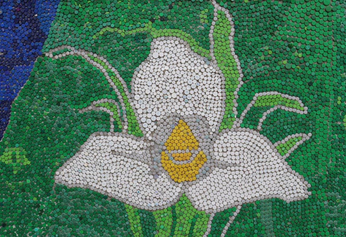 La obra del Eco Mural inició en el 2020 con la idea de promover la reutilización para evitar que los plásticos de un solo uso contaminen las calles, bosques y recursos hídricos.