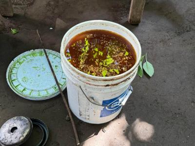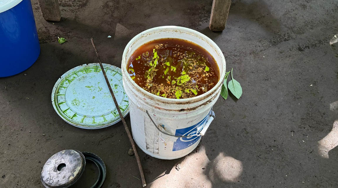 El biopesticida M5 es un compuesto orgánico a base de ajo, chile jalapeño, cebolla morada, jengibre, organismos de montaña, vinagre, melaza y alcohol.