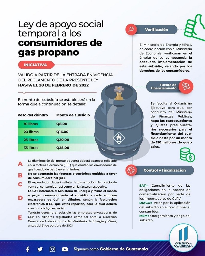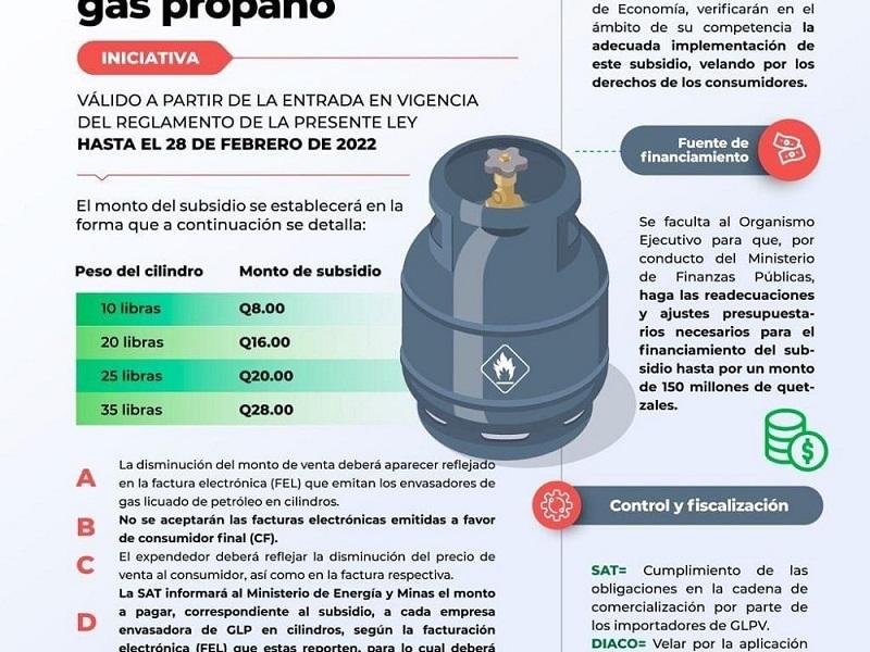 Agregó que la subvención se otorgará por medio del MEM a la empresa que envasa el gas por cada cilindro que se consuma. A su vez la compañía tendrá la obligación de trasladar el subsidio en la cadena de comercialización, hasta que llegue al consumidor final, acción que será verificada por medio de la Dirección de Atención y Asistencia al Consumidor (DIACO) y el MINFIN.