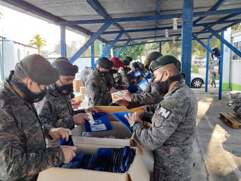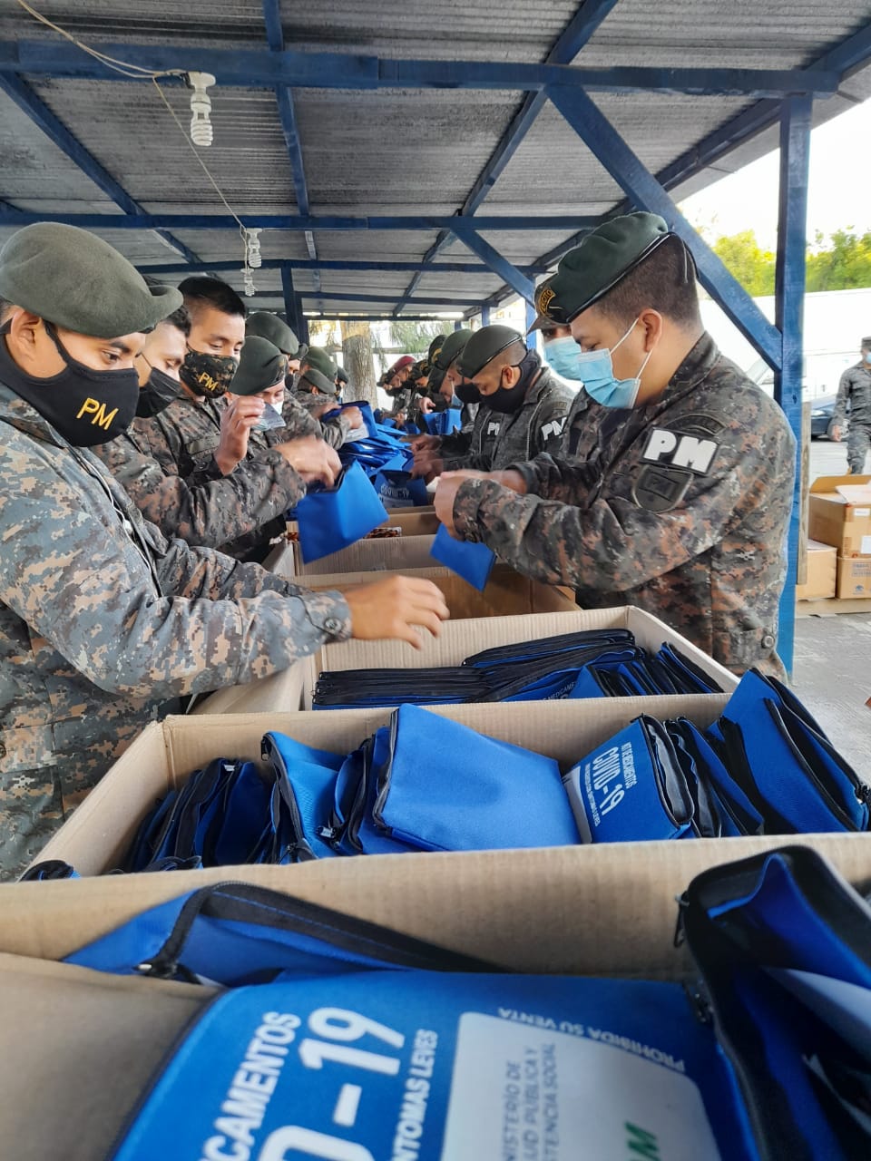 Como parte de estas acciones, Policías Militares de la Primera Brigada de Policía Militar "Guardia de Honor", apoyan en el embalaje de kits con medicamentos para pacientes con síntomas leves de Coronavirus, COVID-19; estos kits de tratamiento contienen antiinflamatorios, antipiréticos, vitamina D y C, zinc, acetaminofén, paracetamol, entre otros medicamentos, que fueron adquiridos por el Ministerio de Salud Pública y Asistencia Social y tienen como finalidad fortalecer la atención primaria, para que las personas con síntomas leves no escalen a pacientes moderados o graves.