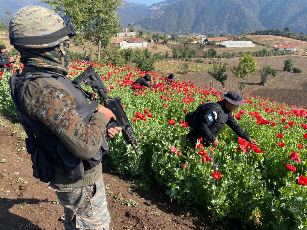 El Ejército de Guatemala, como parte de las acciones interinstitucionales contra el crimen organizado transnacional, apoya desde el 15 de marzo a la Subdirección General de Análisis de Información Antinarcótica (SGAIA) de la Policía Nacional Civil, en la erradicación de plantaciones de ilícitos de la especie amapola, los cuales se encontraban en 68 campos de cultivo en los caseríos Las Flores, San Juan los Altos y San Andrés, del municipio de Ixchiguán, San Marcos. Dichas acciones, según los datos publicados por la PNC permitieron hasta el 17 de marzo, la erradicación e incineración de 7 millones 349 mil 298 matas, que fueron valoradas por más de 183 millones de quetzales.