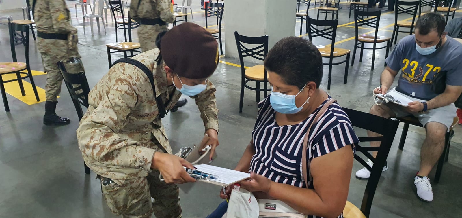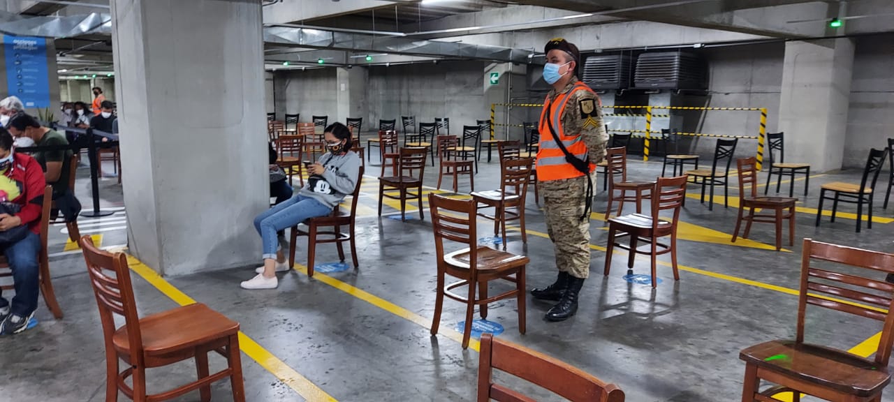 El Ejército de Guatemala, a través del Servicio de Sanidad Militar y Reservistas Militares del departamento de Guatemala, apoya al Ministerio de Salud Pública y Asistencia Social (MSPAS), en el puesto de vacunación contra el Coronavirus, COVID-19 que inició a operar en el centro comercial Oakland Mall, ubicado en la zona 10 de la ciudad capital.