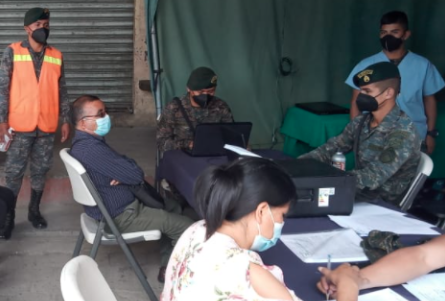 Soldados de la Quinta Brigada de Infantería "Mariscal Gregorio Solares", se encuentran apoyando desde el pasado 23 de julio, al Ministerio de Salud Pública y Asistencia Social, en un puesto de vacunación instalado en la terminal de buses y mercado municipal de la cabecera departamental de Huehuetenango.
