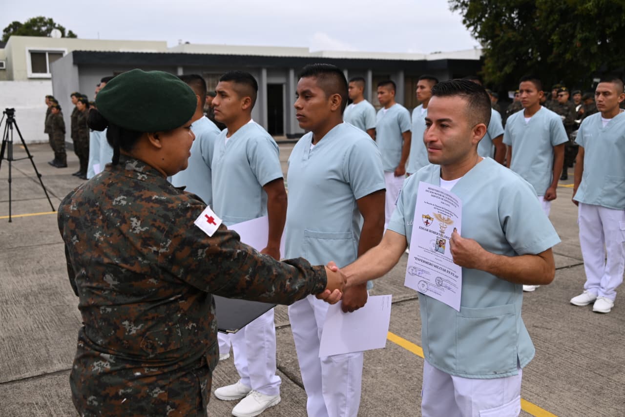 Durante la ceremonia se reconoció el compromiso, disciplina y dedicación de los 25 nuevos enfermeros, entre ellos tres mujeres, que culminaron satisfactoriamente su proceso de formación con una duración de ocho meses, orientado al desempeño eficiente de funciones sanitarias en el campo militar y a la atención integral del soldado guatemalteco, que incluyó conocimiento en diferentes campos: nociones de enfermería, medicina quirúrgica, control de signos vitales, laboratorios y muestra de diagnóstico; anatomía, fisiología y clinopatología; prevención y promoción de la salud y saneamiento del medio; atención pre hospitalaria; medicina táctica militar; atención médica de combate, entre otras.