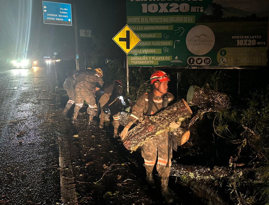 En el departamento de Huehuetenango, rescatistas de la Brigada de Ayuda Humanitaria y de Rescate (BHR), junto a soldados de la Quinta Brigada de Infantería e Ingenieros Militares, apoyan las tareas de limpieza del derrumbe registrado en los kilómetros 163 y 165 de la carretera CA-1, en dirección a la ciudad capital; logrando liberar la vía, permitiendo el paso de vehículos. Asimismo, soldados de la Séptima Brigada de Infantería con sede en Baja Verapaz, junto a rescatistas de la BHR, apoyaron las tareas de remoción de escombros de un árbol que cayó sobre la carretera que conduce desde Salamá hacia La Cumbre en el municipio de San Jerónimo.