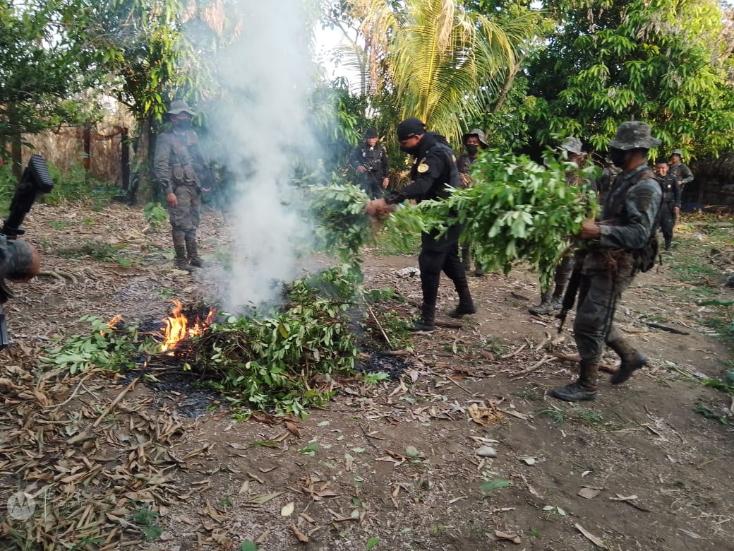 Soldados del Ejército de Guatemala, en conjunto con fuerzas de seguridad civil, erradicaron este 2 de abril, un total de 3 mil 600 arbustos de hoja de coca, ilícitos que se encontraban cultivados en el municipio de Sayaxché, Petén y que fueron localizados por el personal militar como parte de las operaciones contra el crimen organizado transnacional.