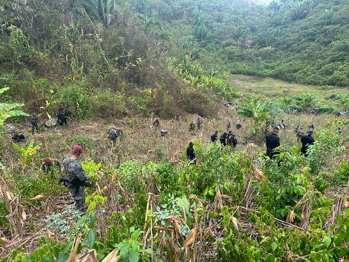 Esta mañana, finalizó la operación interinstitucional de erradicación de plantaciones hojas de coca, con presencia de elementos de la Subdirección General de Análisis de Información Antinarcótica de la Policía Nacional Civil, llevando a cabo la erradicación de un total de 23,600 arbustos en fase de crecimiento.