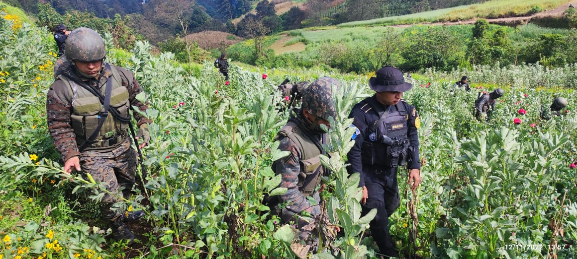 Los constantes patrullajes y vigilancia que el Ejército de Guatemala mantiene en toda la república contra el crimen organizado transnacional y el resguardo de la soberanía, han dado como resultado notables golpes a este tipo de delitos, entre los que se encuentran la erradicación de una plantación de hoja de coca en Izabal y dos campos de cultivo de amapola en el departamento de San Marcos.