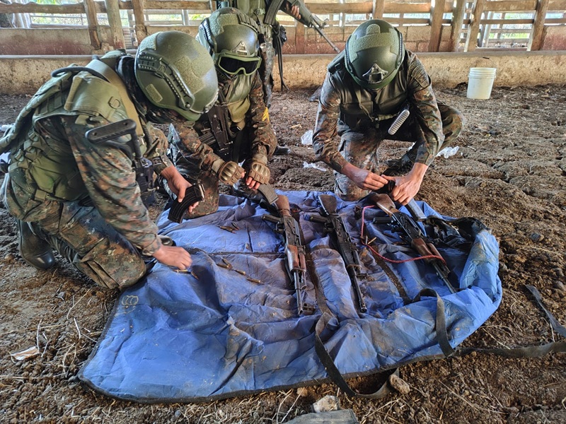 Asimismo, en operaciones de reconocimiento efectuadas en la misma localidad, personal militar localizó armamento de alto calibre abandonado, consistente en: 3 fusiles tipo AK, 1 escopeta, 5 granadas de fragmentación, 8 cargadores para fusil y 80 cartuchos calibre 7.62 mm; 1 bípode para ametralladora, 4 cajas para armas tipo pistola, 15 radios portátiles, 7 bases de cargador para radio y una mochila para transporte de munición.
