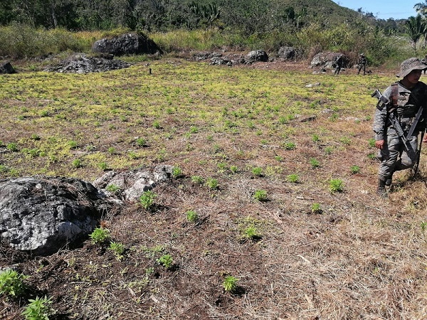 El Ejército de Guatemala, durante operaciones de seguridad en el departamento de Petén, localizó este lunes 21 de febrero, una plantación que se presume corresponden al ilícito denominado marihuana, a inmediaciones de las aldeas El Rondón y Los Laureles, del municipio de Melchor de Mencos.