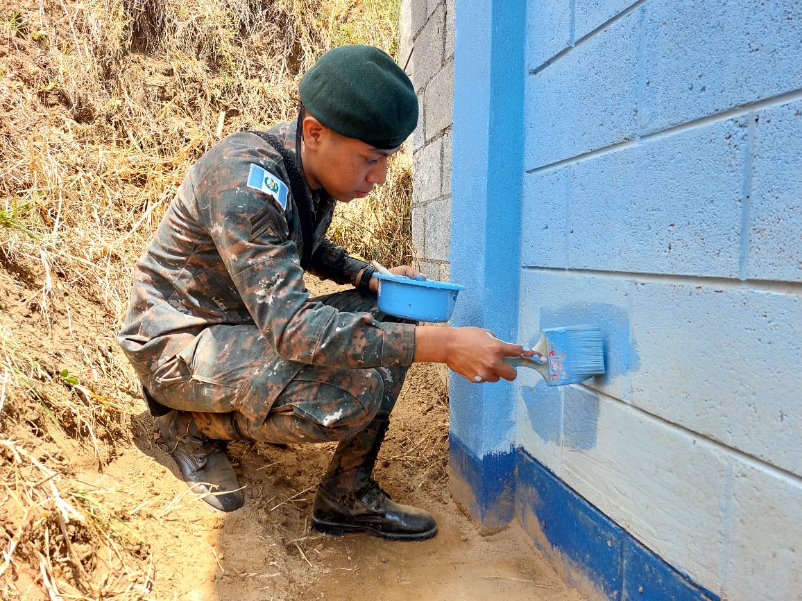 Como parte de estas actividades, el fin de semana recién pasado, soldados de la Brigada de Operaciones para Montaña, con sede en el departamento de San Marcos, en coordinación con la comunidad educativa de la Escuela Oficial Rural Mixta caserío Navidad, Las Lagunas, apoyaron la jornada de limpieza y remozamiento de pintura del plantel educativo.