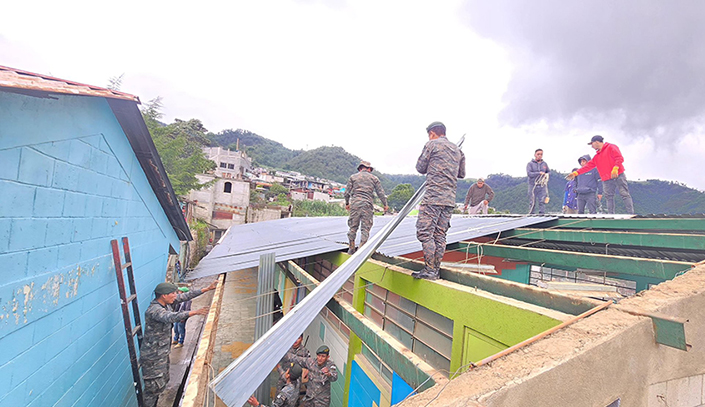 En el departamento de Sololá, soldados de la Quinta Brigada de Infantería “Mariscal Gregorio Solares” junto a Policías Militares de la Segunda Brigada de Policía Militar “General de División Héctor Alejandro Gramajo Morales”, trabajaron en coordinación con la comunidad educativa de la en la Escuela Oficial Rural Mixta del cantón Patzité, Tierra Fría, Nahualá, realizando el remozamiento de techos a diferentes aulas con el fin de evitar filtraciones de agua durante la temporada lluviosa; asimismo, se realizó la deschatarrización de todos aquellos elementos que podrían convertirse en criaderos de zancudos y otros vectores, como parte de las acciones que contribuyen a disminuir la propagación de enfermedades como el dengue, chikungunya o sika.