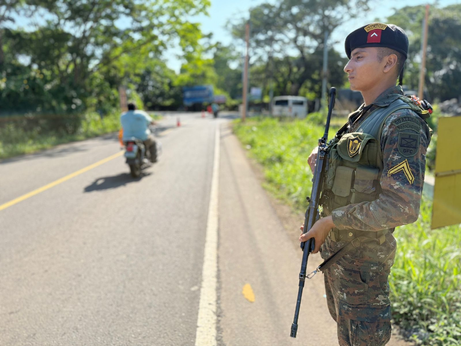 El Ejército de Guatemala, a través de la Brigada de Paracaidistas “General Felipe Cruz”, desarrolla patrullajes de seguridad a pie y motor, así como puestos de control en distintos puntos del departamento de Retalhuleu. Estas acciones forman parte de las operaciones continuas que se realizan con el propósito de fortalecer la presencia institucional y contribuir a un entorno más seguro.