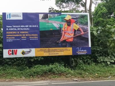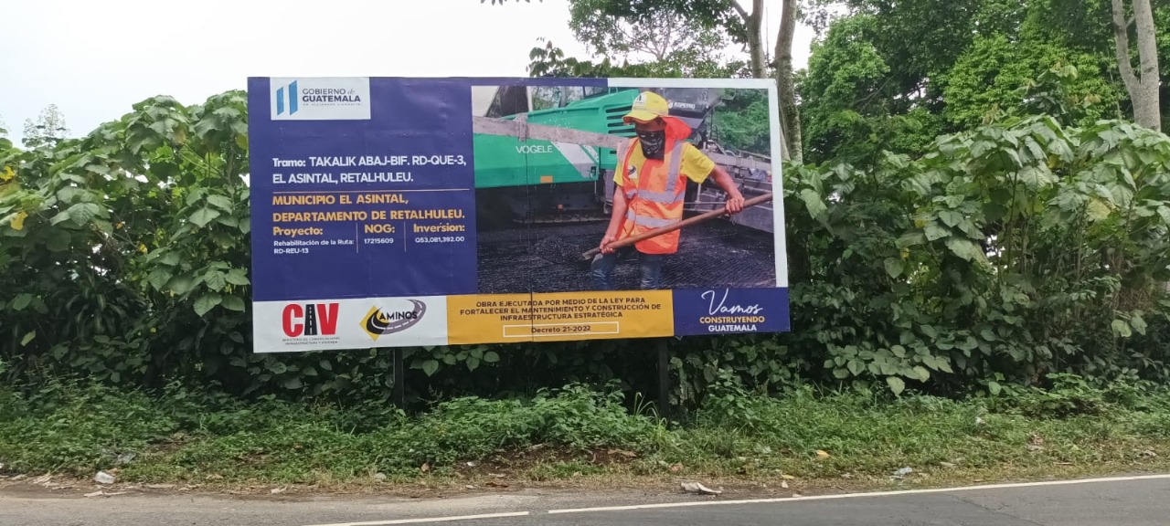 El Ministerio de Comunicaciones, Infraestructura y Vivienda -CIV-, por medio de la Dirección General de Caminos -DGC-, trabaja en el mejoramiento de la carretera Ruta RD-REU-13, Tramo: Tak´alik Ab´aj -BIF- RD-QUE-3, El Asintal, Retalhuleu.