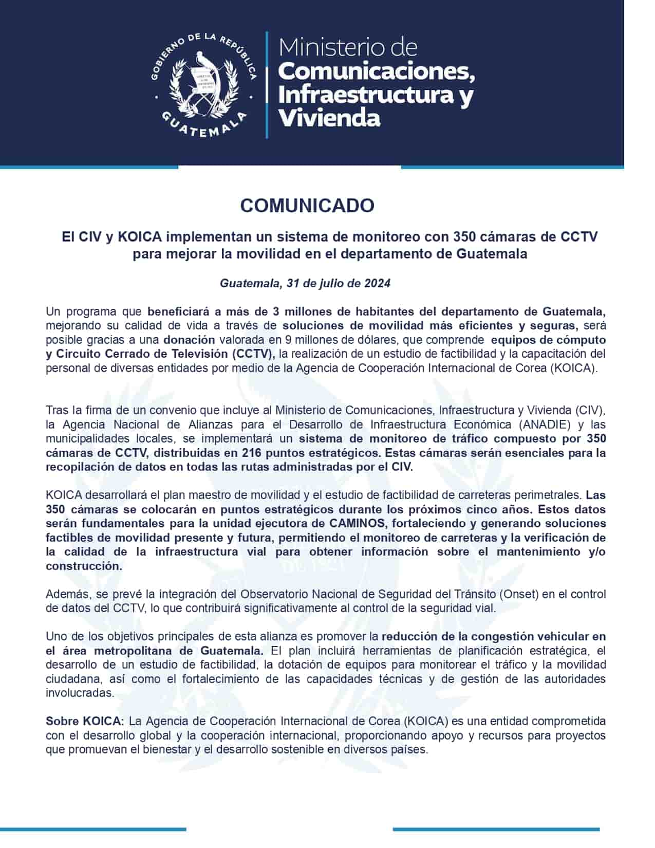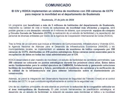 Un programa que beneficiará a más de 3 millones de habitantes del departamento de Guatemala, mejorando su calidad de vida a través de soluciones de movilidad más eficientes y seguras, será posible gracias a una donación valorada en 9 millones de dólares, que comprende equipos de cómputo y Circuito Cerrado de Televisión (CCTV), la realización de un estudio de factibilidad y la capacitación del personal de diversas entidades por medio de la Agencia de Cooperación Internacional de Corea (KOICA).