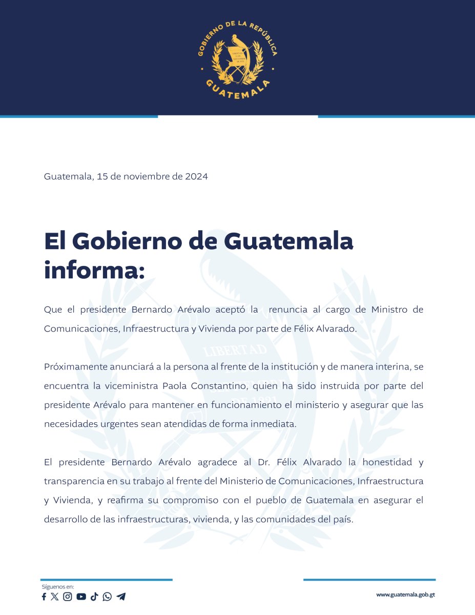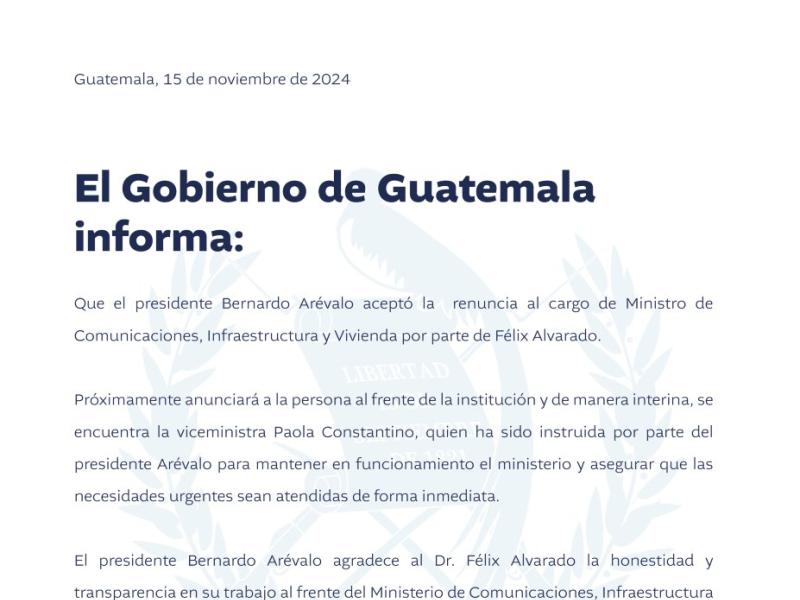 Que el presidente Bernardo Arévalo aceptó la renuncia al cargo de Ministro de Comunicaciones, Infraestructura y Vivienda por parte de Félix Alvarado.