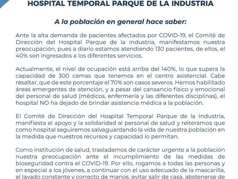 El Hospital Temporal Parque de la Industria a la población en general hace saber:
