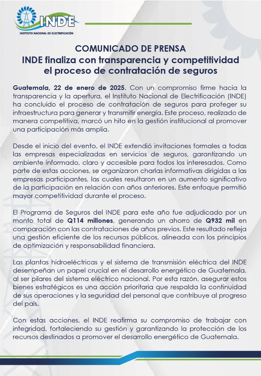 El programa de Seguros del INDE para este año fue adjudicado por un monto total de Q114 millones, generando un ahorro de Q932 mil en comparación de las contrataciones de años previos.