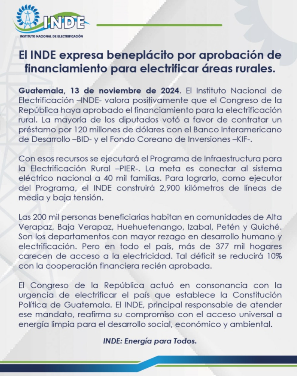Con este financiamiento el Congreso de la República actuó en consonancia con la urgencia de electrificar el país que establece la Constitución Política de Guatemala. El INDE, principal responsable de atender ese mandato, reafirma su compromiso con el acceso universal a energía limpia para el desarrollo social, económico y ambiental.