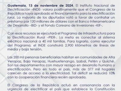 Comunicado oficial del INDE tras aval de Diputados en el financiamiento para electrificación rural.