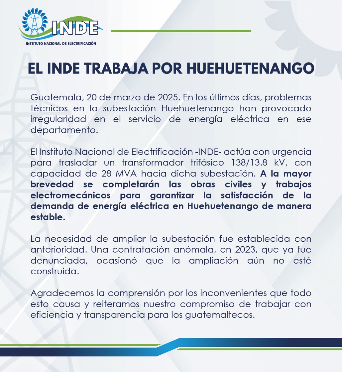 En los últimos días, se han registrado problemas técnicos en la subestación Huehuetenango ocasionando irregularidades en el servicio de transmisión. Actualmente el INDE trabaja en el traslado de un transformador trifásico con una capacidad de 28 MVA.
