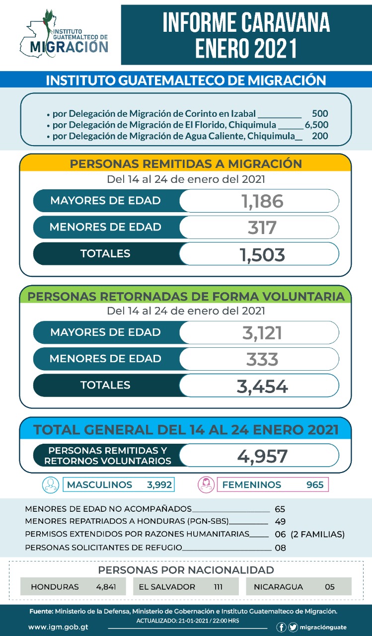 Al confirmase la salida de la movilización masiva, el IGM, estaría convocando a las instituciones que forman parte de la atención a la población migrante haciendo un esfuerzo interinstitucional, velando por el cumplimiento de los protocolos de bioseguridad establecidos, el Estado de Guatemala actuará conforme a la legislación vigente, promoviendo una migración regular, ordenada y segura.