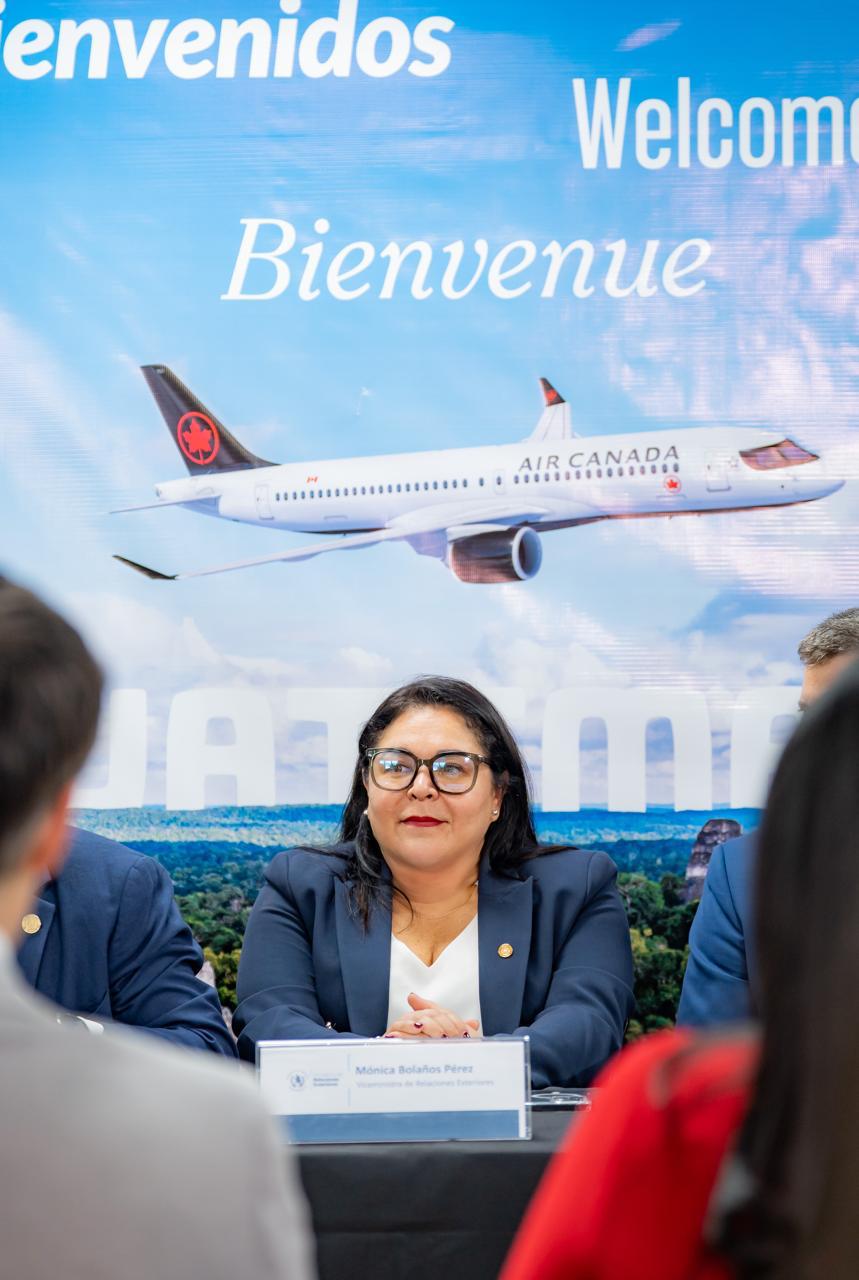 Durante su intervención, la Viceministra Bolaños Pérez destacó que esta nueva ruta aérea, esfuerzo que se enmarca en la política de diplomacia comercial promovida por la Cancillería, potenciará la conectividad internacional, impulsará el turismo y facilitará el acercamiento entre la comunidad guatemaltecas en Canadá y sus familias en Guatemala.