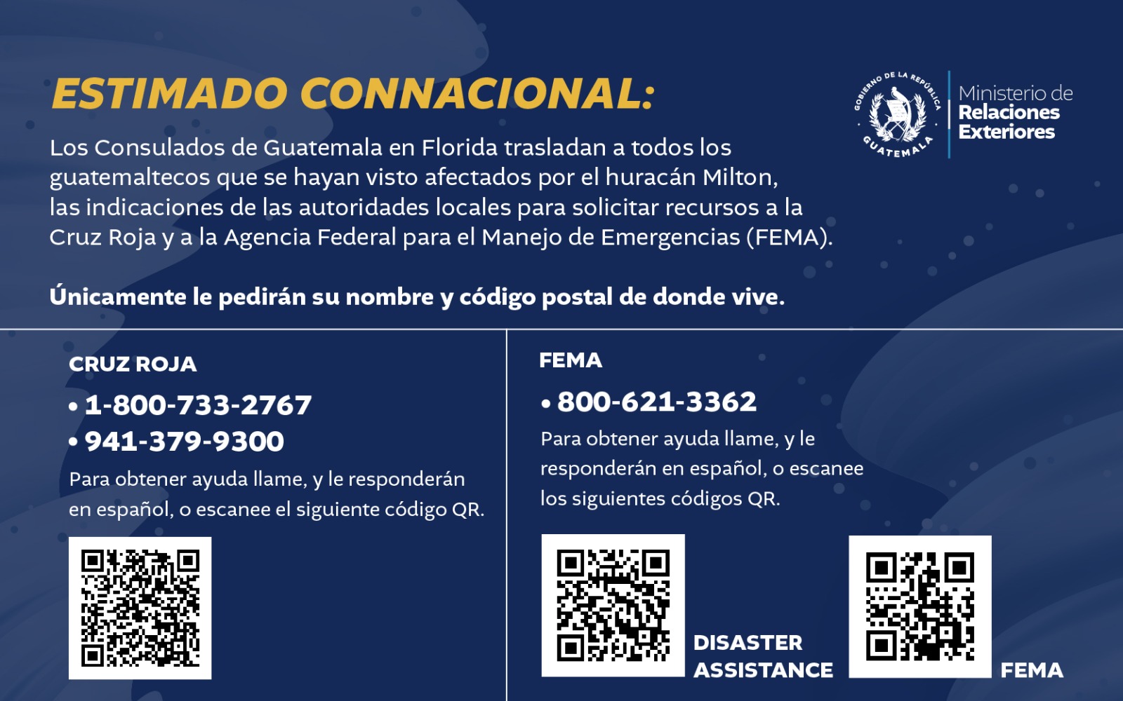 El Minex, por medio de su Red Consular, da seguimiento a la situación de los guatemaltecos en Florida tras el paso del huracán Milton