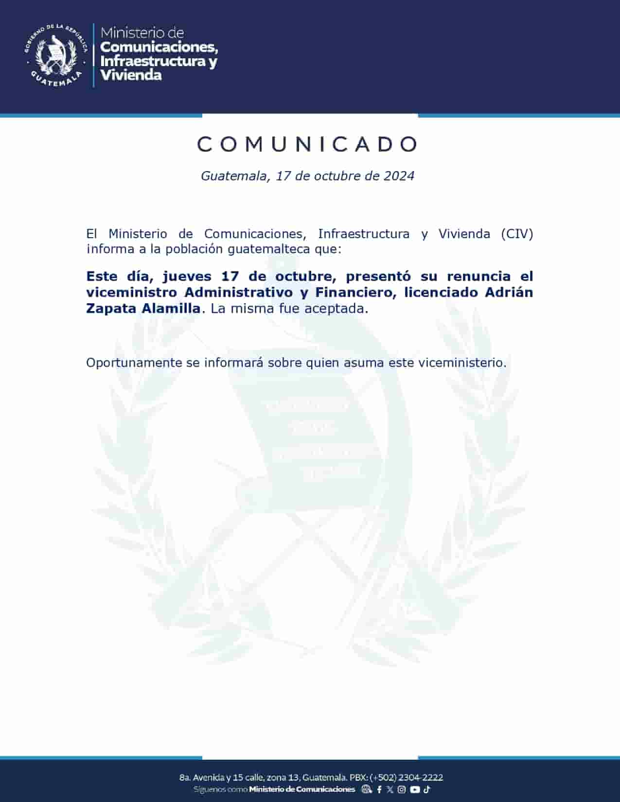Este día, jueves 17 de octubre, presentó su renuncia el viceministro Administrativo y Financiero, licenciado Adrián Zapata Alamilla. La misma fue aceptada.