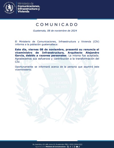 Este día, viernes 08 de noviembre, presentó su renuncia el viceministro de Infraestructura, Arquitecto Alejandro García, debido a razones personales. La misma fue aceptada. Agradecemos sus esfuerzos y contribución a la transformación del CIV.