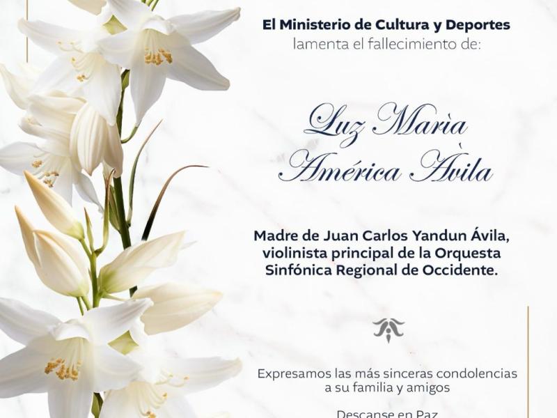 Lamentamos profundamente el sensible fallecimiento de Luz María América Ávila, madre de Juan Carlos Yandun Ávila, violinista principal de la Orquesta Sinfónica Regional de Occidente.