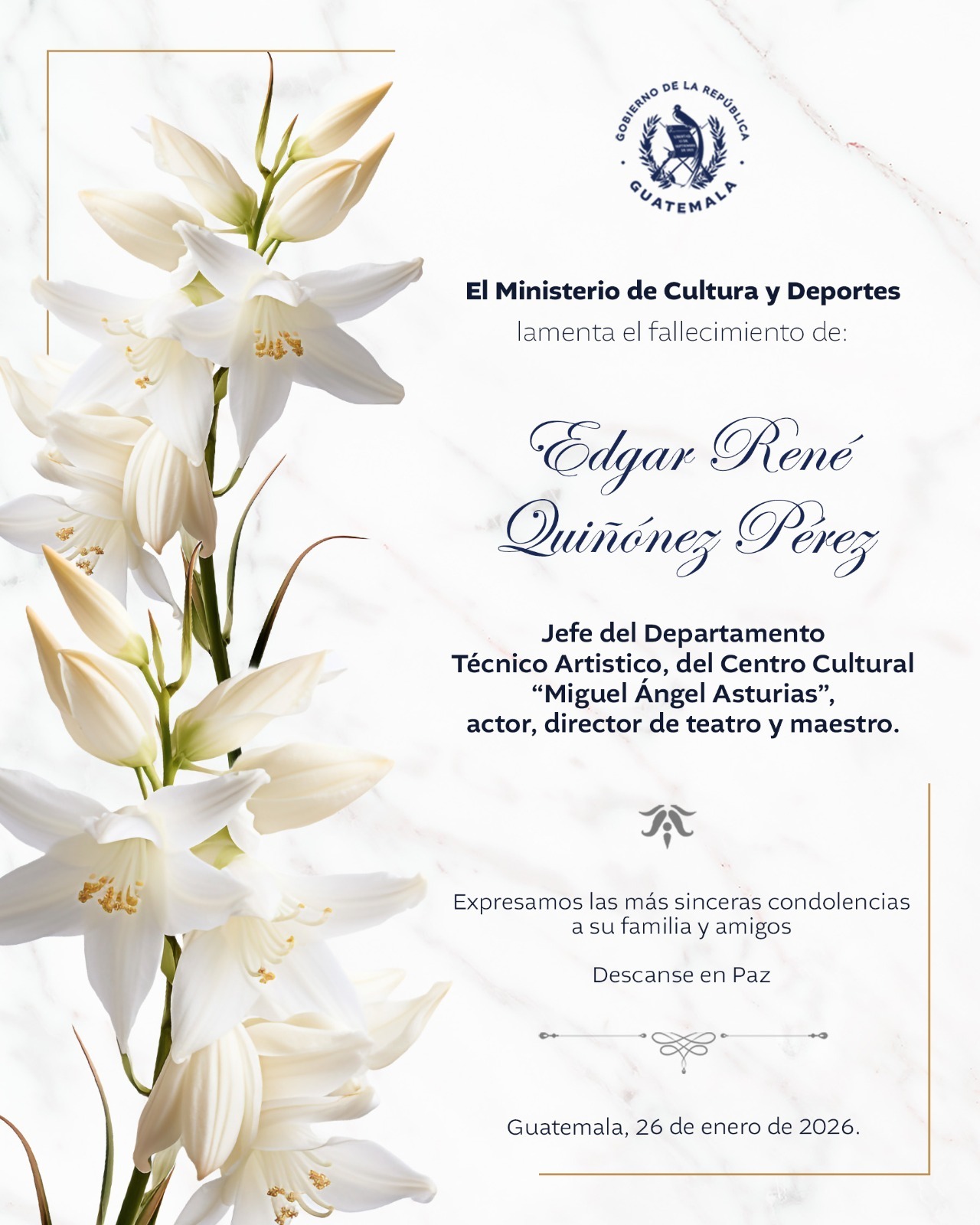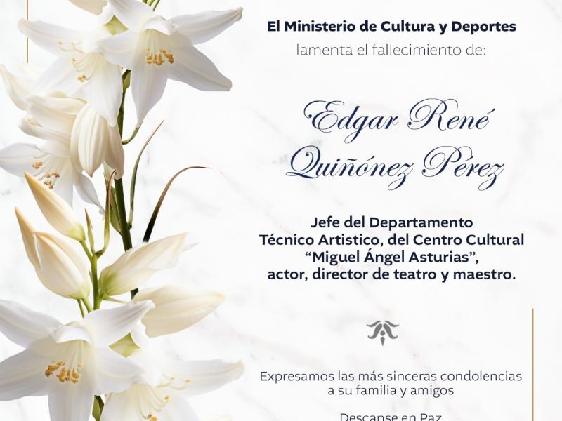 Lamentamos profundamente el sensible fallecimiento de Edgar René Quiñónez Pérez, Jefe del Departamento Técnico Artístico, del Centro Cultural «Miguel Ángel Asturias».