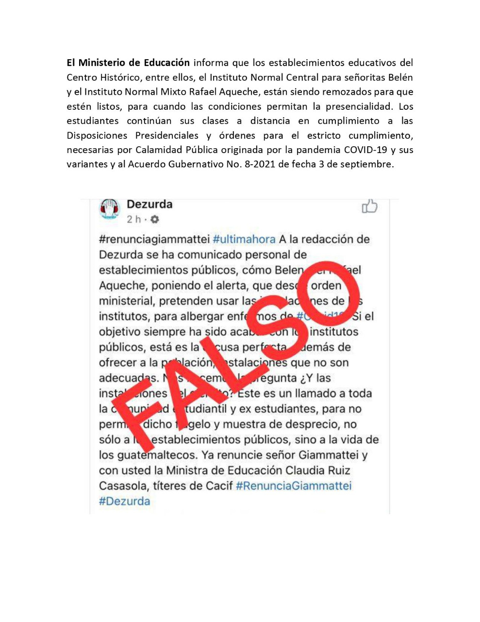 El Ministerio de Educación informa que los establecimientos educativos del Centro Histórico, entre ellos, el Instituto Normal Central para señoritas Belén y el Instituto Normal Mixto Rafael Aqueche, están siendo remozados para que estén listos, para cuando las condiciones permitan la presencialidad. Los estudiantes continúan sus clases a distancia en cumplimiento a las Disposiciones Presidenciales y órdenes para el estricto cumplimiento, necesarias por Calamidad Pública originada por la pandemia COVID-19 y sus variantes y al Acuerdo Gubernativo No. 8-2021 de fecha 3 de septiembre.