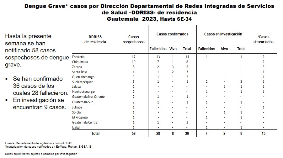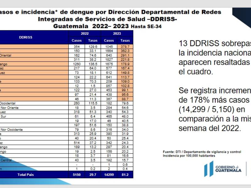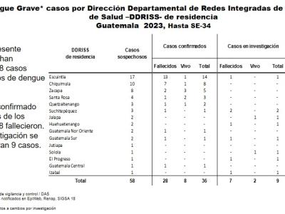 Como parte de la vigilancia y monitoreo del dengue la Dirección de Epidemiología y Gestión de Riesgo del Ministerio de Salud Pública y Asistencia Social da a conocer la situación epidemiológica del dengue en Guatemala, con datos a la semana 34 de 2023.