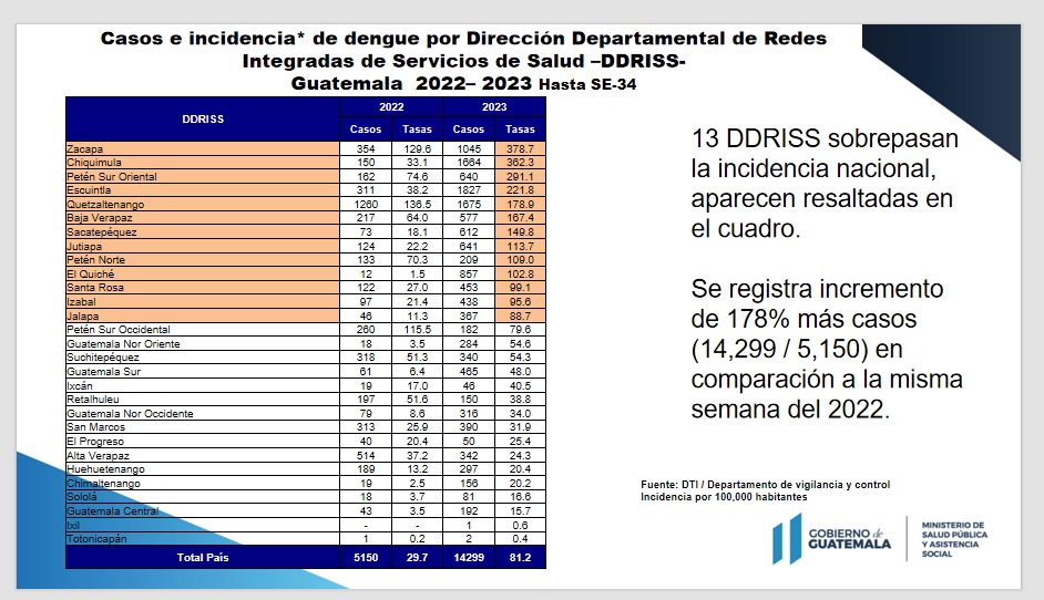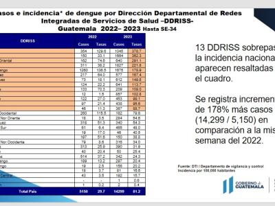 En comparación con la misma semana del 2022 (5,150) se registra un incremento de 178% más de casos (14,299), de los cuales el 14% corresponde a dengue con signos de alarma y el 85% a dengue sin signos de alarma, siendo Zacapa el departamento que presenta la mayor incidencia de dengue con signos de alarma.
