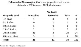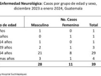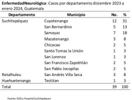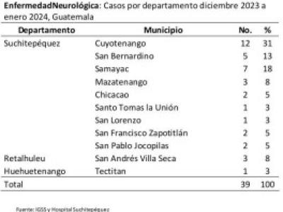 El Ministerio de Salud Pública y Asistencia Social -MSPAS- mantiene activa la vigilancia epidemiológica de 39 casos de enfermedad neurológica aguda, detectados por el hospital del Instituto Guatemalteco de Seguridad Social -IGGS - de Suchitepéquez y el Hospital Nacional de Mazatenango. Son pacientes originarios de 3 departamentos: Suchitepéquez con 35 casos, Retalhuleu 3 y Huehuetenango 1.