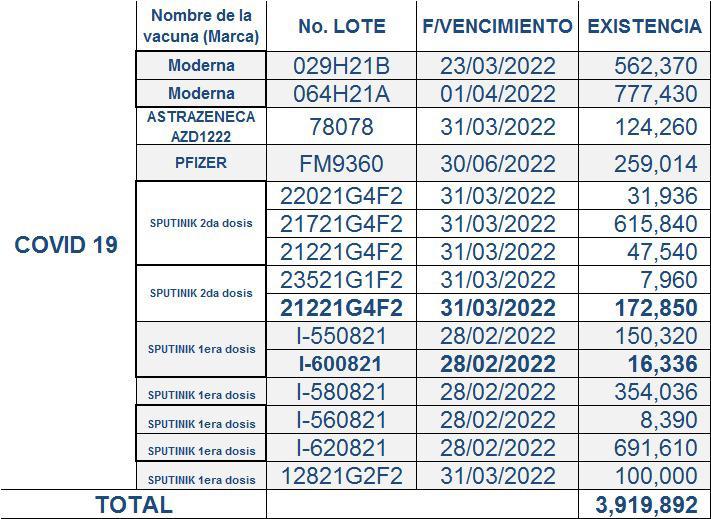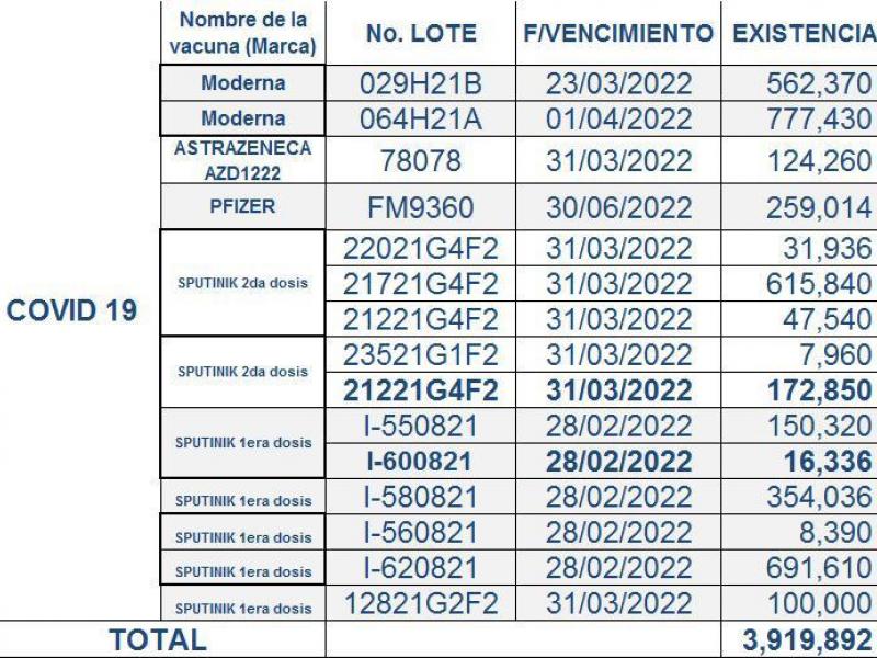 Nuestro compromiso en la lucha contra el Covid-19, por lo que la información que circula del vencimiento de 1,383,920 dosis de vacuna SPUTNIK V es FALSA, ya que el personal de este Ministerio en las 29 áreas de salud a nivel nacional, cumple con el Plan Nacional de Vacunación.