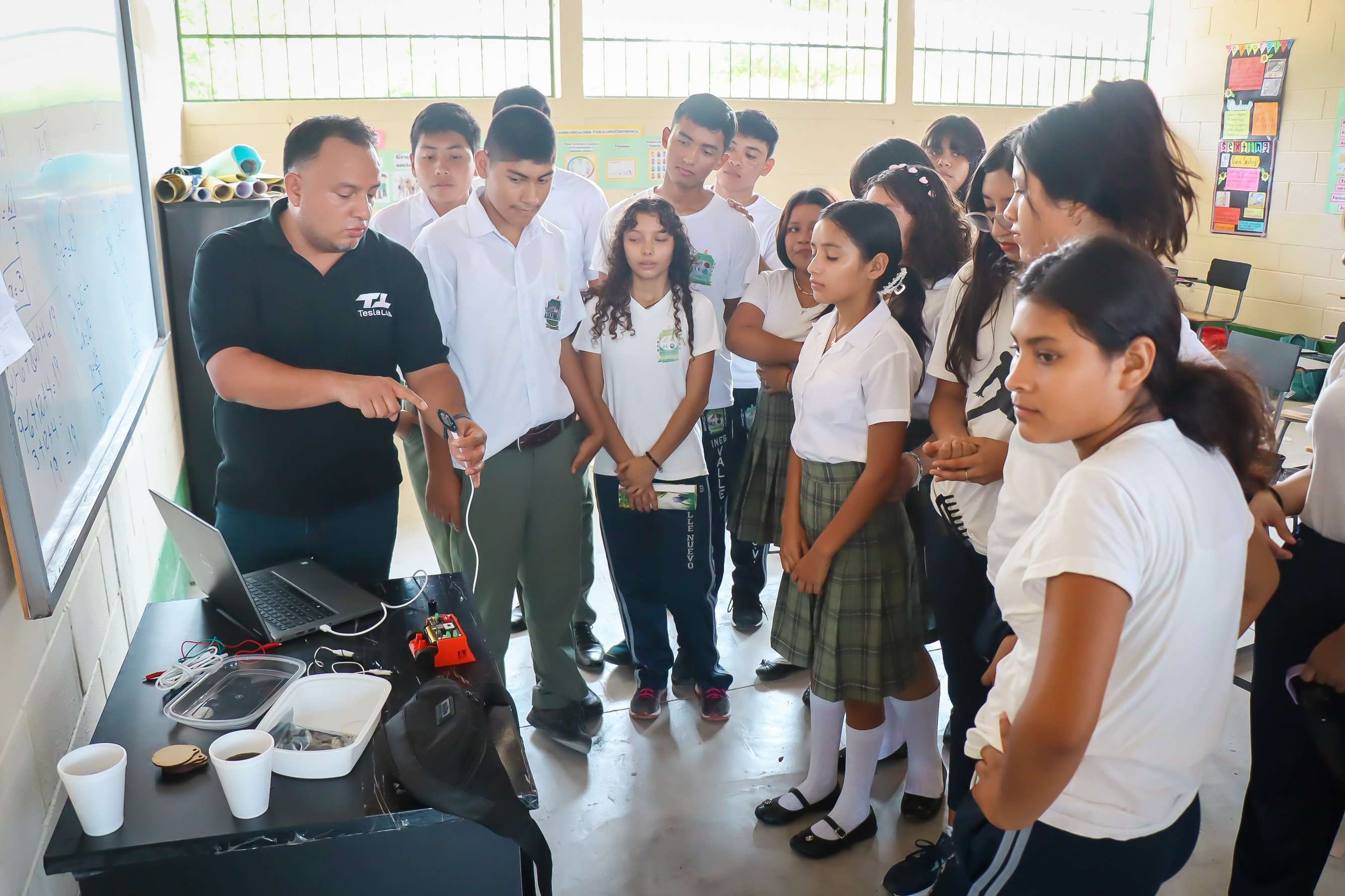 La explicación a los alumnos de tercero básico del Instituto Nacional de Educación Básica, barrio Valle Nuevo, en San Benito, Petén, la impartió el ingeniero Oscar Rodas, representante de la Universidad Galileo, e integrante de la Comisión técnica de industria del Sistema Nacional de Ciencia y Tecnología (Sincyt).