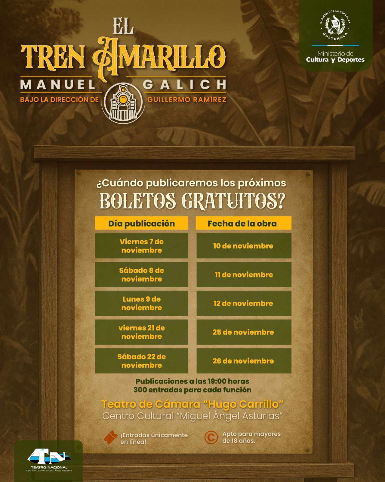 Con clamoroso éxito, el miércoles 4 de noviembre se estrenó la obra teatral El Tren Amarillo, escrita en 1954 por el dramaturgo guatemalteco Manuel Galich, en el Teatro de Cámara “Hugo Carrillo del Centro Cultural “Miguel Ángel Asturias”.